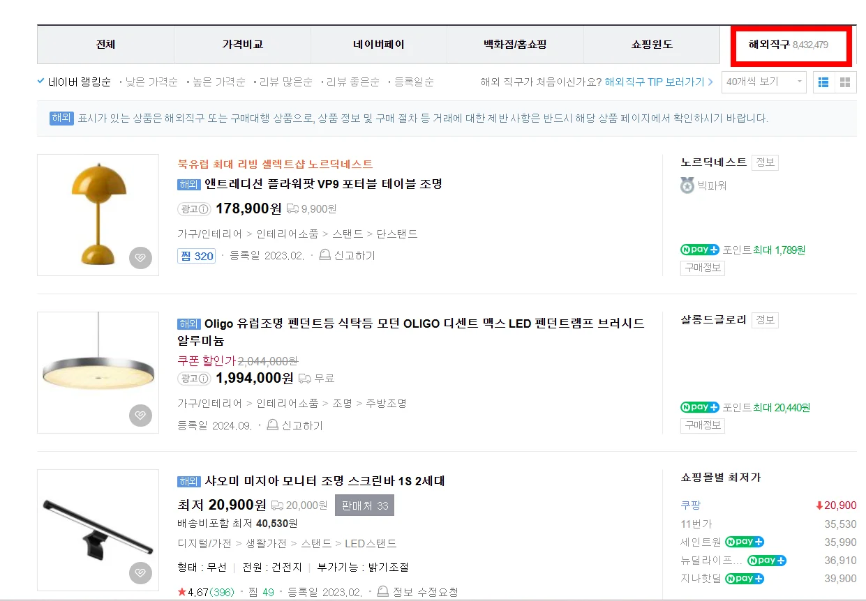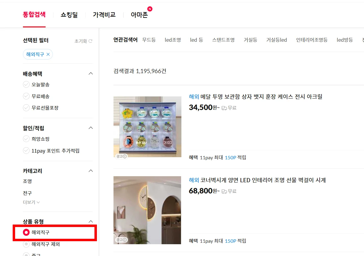 ‘해외직구’ 태그가 붙은 제품을 검색하고, 판매 인기순으로 정렬하세요.
