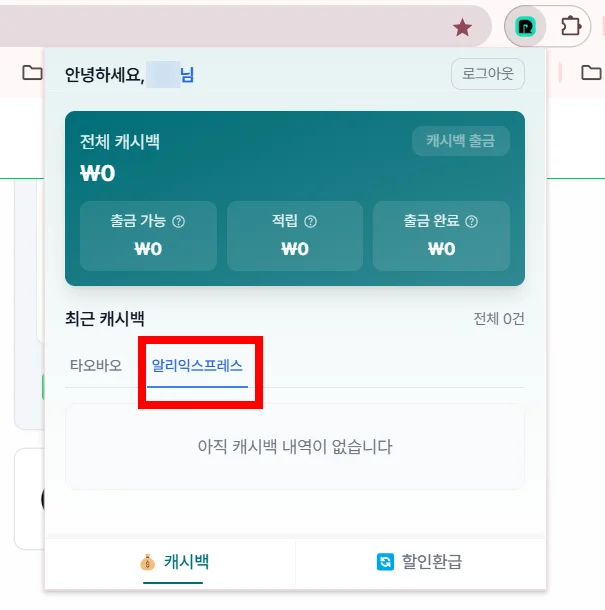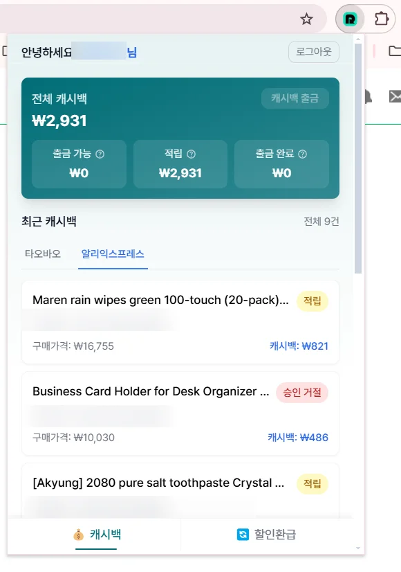 설치 후 리펀디 아이콘을 클릭해 회원가입을 완료하면, 대시보드에서 타오바오와 알리익스프레스에서 적립한 캐시백 내역을 확인할 수 있습니다.