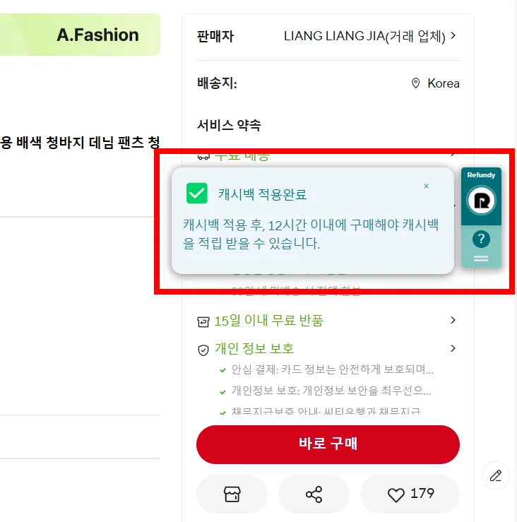 리펀디 확장 프로그램이 설치된 상태라면, 상품 페이지의 우측에 리펀디 버튼이 나타납니다. 해당 상품이 캐시백 적립 대상인지 확인한 후, '최대 11% 캐시백 받기' 버튼을 클릭합니다.